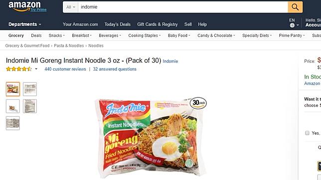 Indomie Goreng dijual di situs Amazon.com, banyak warga Amerika Serikat yang keranjingan memakannya.